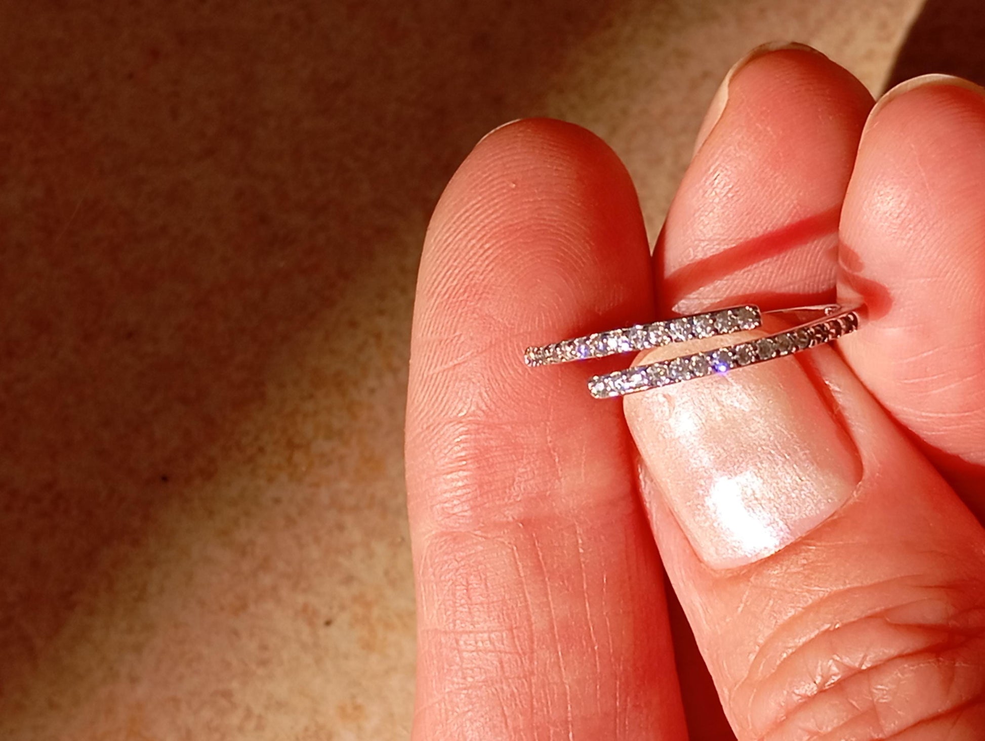 This elegant spiral wrap ring is crafted from genuine 925 sterling silver and features a unique open-band design. The two sparkling cubic zirconia stones on each end add just the right amount of shimmer, while the thin silver band wraps gracefully around the finger.