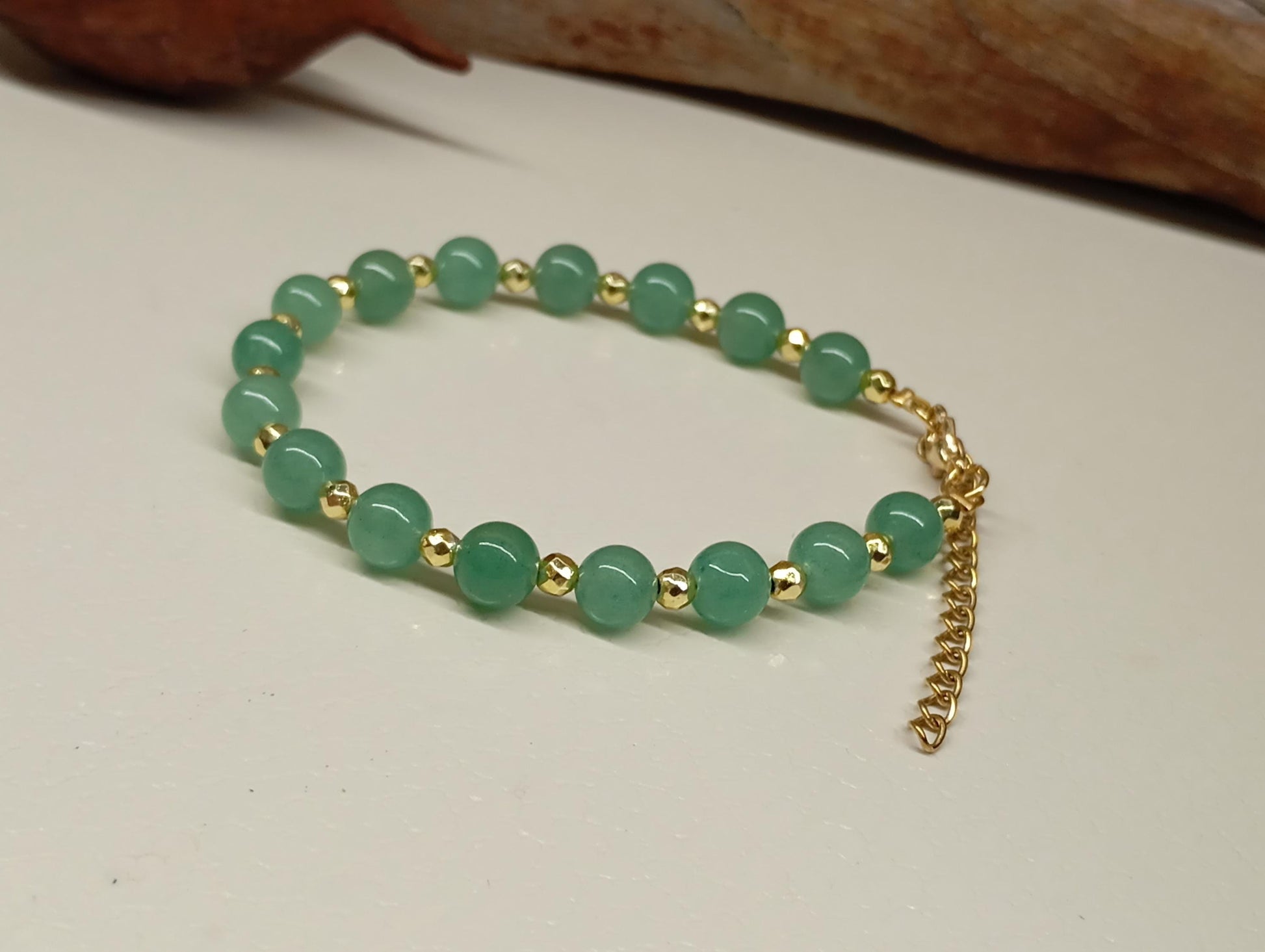 or green aventurine in your choice, including hematite gold tonned faceted beads, steel wire, gold plated closure and adjustable chain