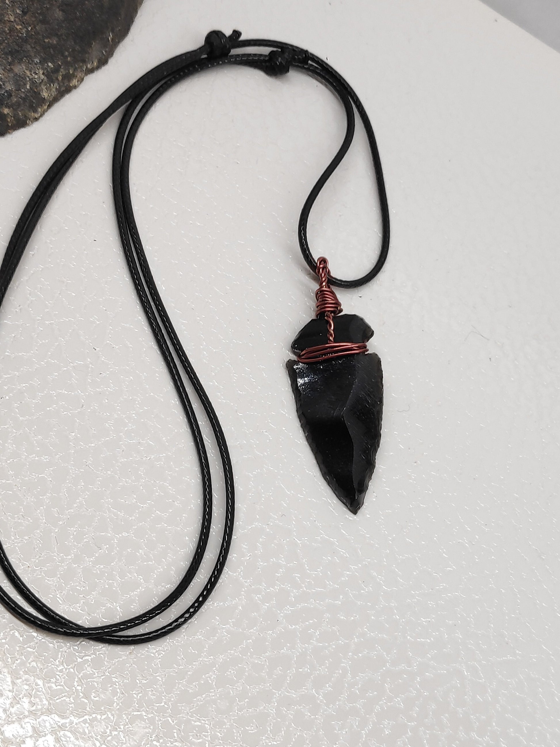 Handmade Unisex necklace with raw black obsidian arrowhead carved crystal pendant with nylon necklace cord or stainless steel chain in your choice, wrapped with copper wire.