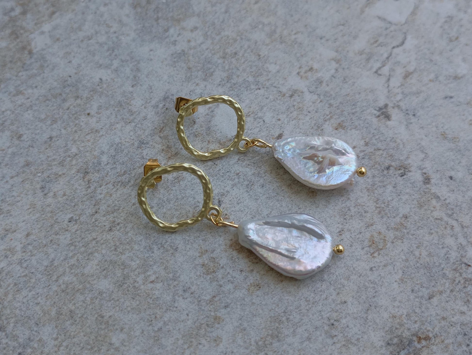 natural white freshwater pearls drop shape earrings, stainless steel studs matt golden colour hollow circle studs earrings, beautiful and catching eye earrings, wonderful gift idea for women