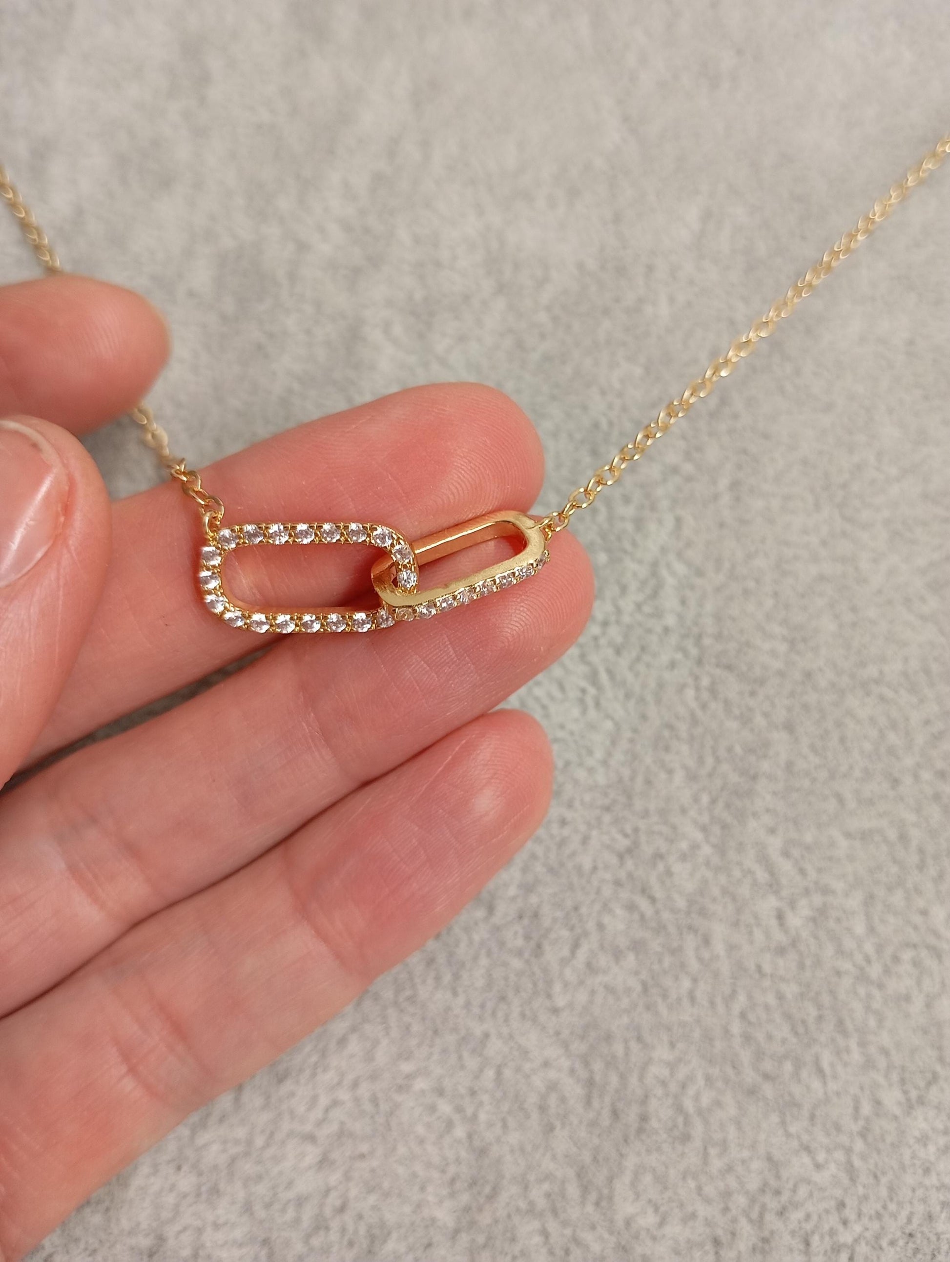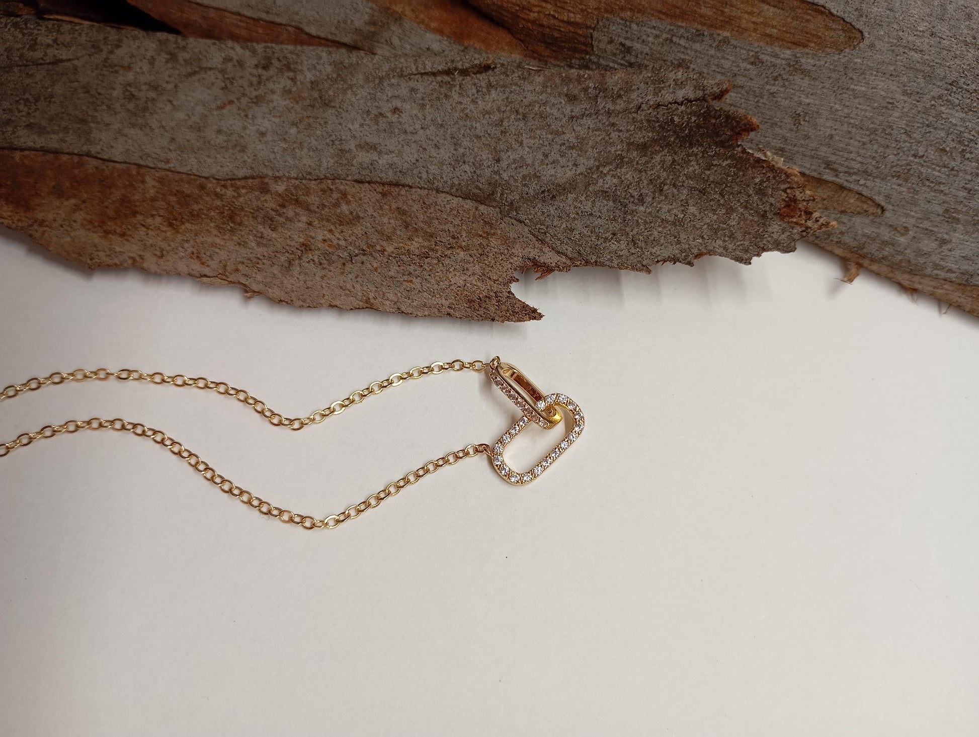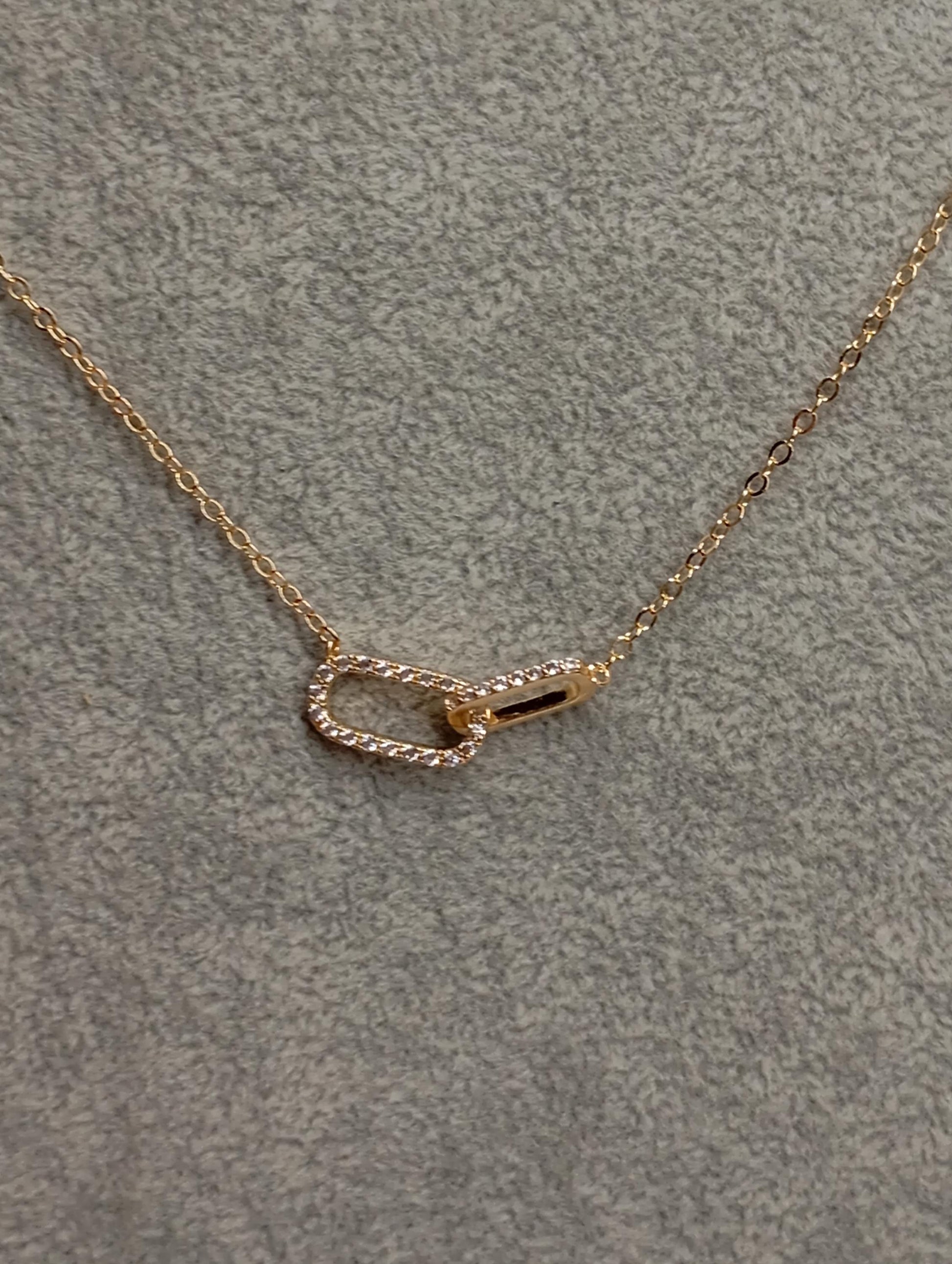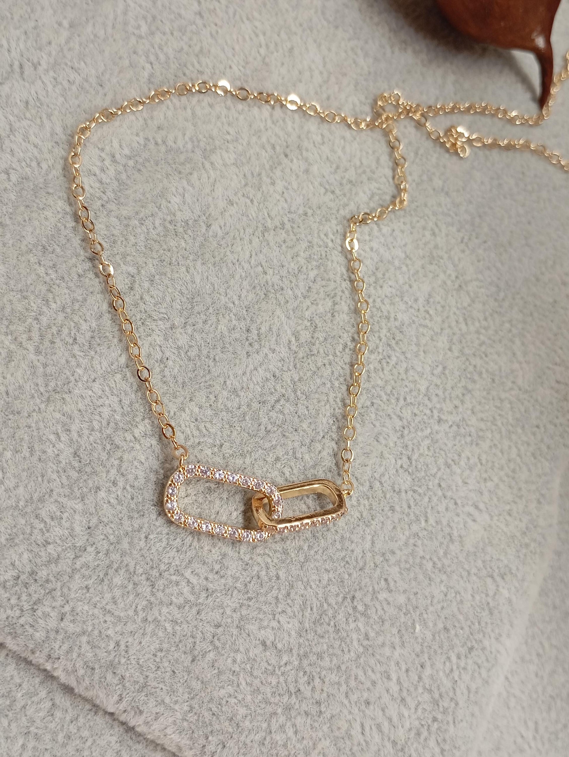 This elegant necklace features a modern double-link pendant with a sparkling rhinestone oval and a smooth gold-tone link, connected on a delicate chain. The clean geometric design gives this piece a refined yet trendy look, perfect for everyday wear or special occasions.