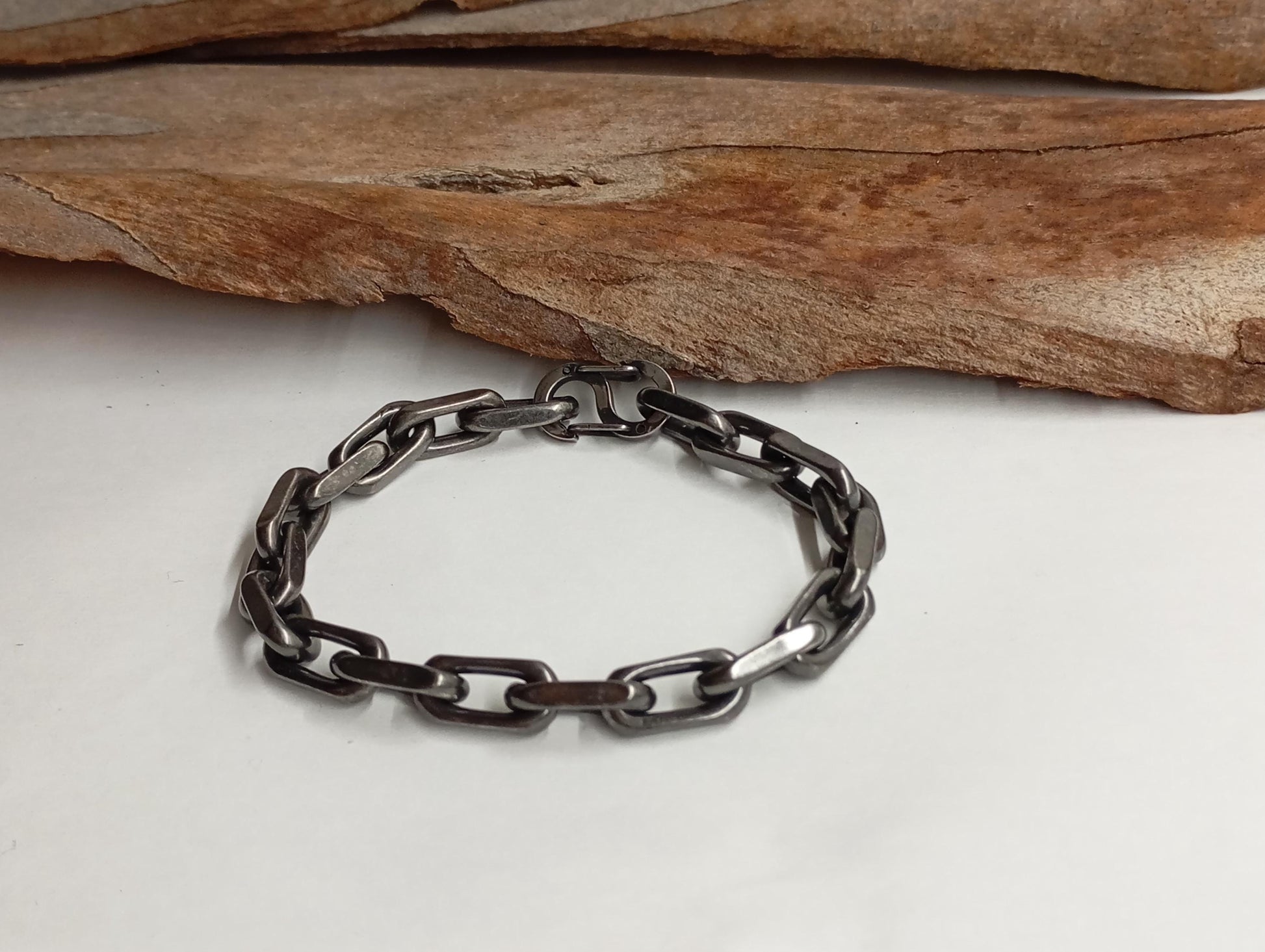 Elevate your style with this rugged and bold handmade chain bracelet, crafted from oxidized steel for a vintage, industrial look. Featuring a chunky curb chain design, this bracelet is both sturdy and stylish, making it perfect for everyday wear or as a statement piece.