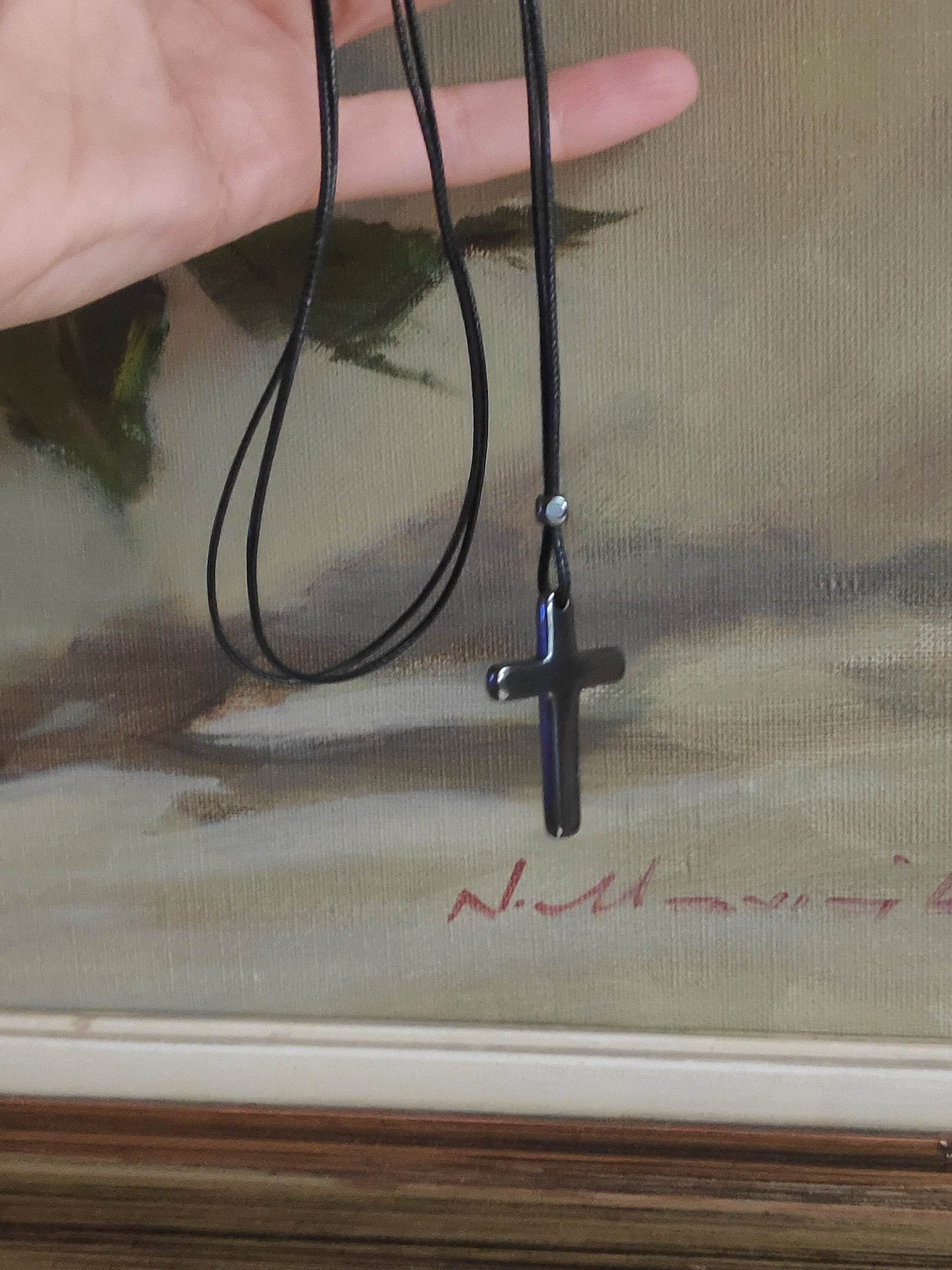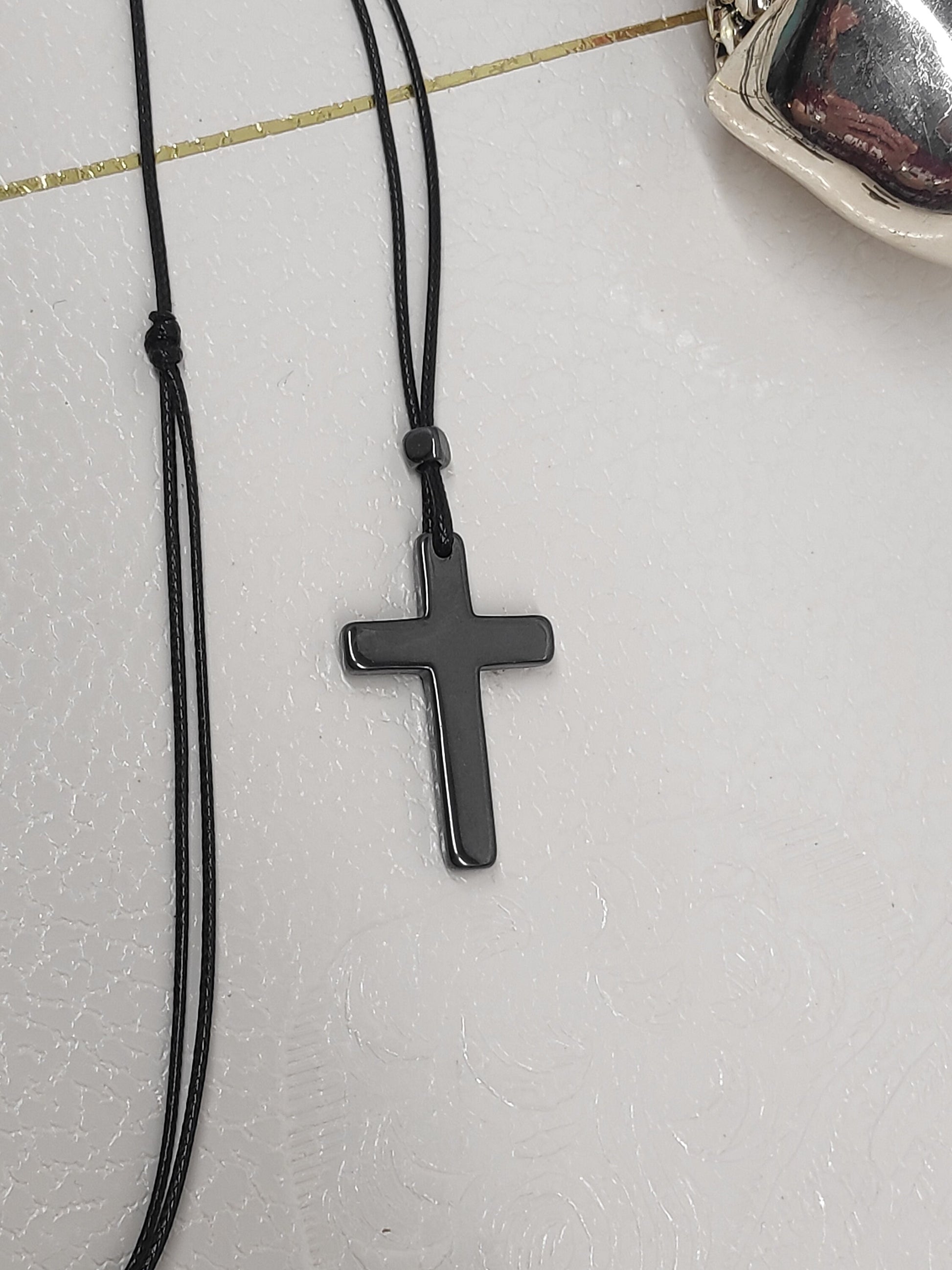 Hematite Cross Pendant Necklace, Christian Religious Classic Cross Charms Gemstone Cross, black cord necklace Men , Gift for beliver