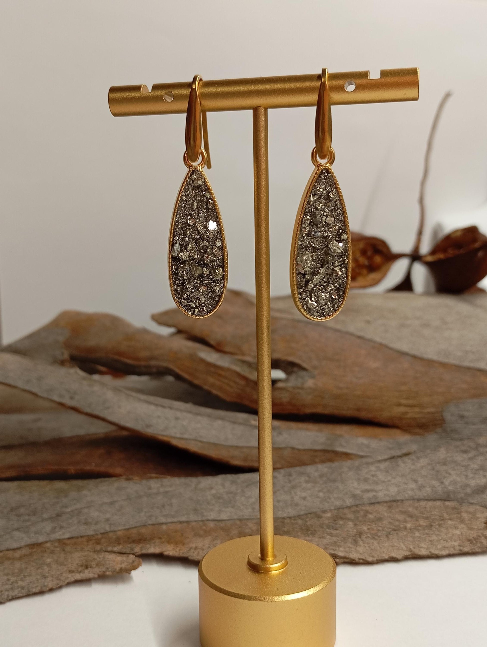 stainless steel drop shape gold plated hooks earrings with natural raw iron Pyrite cubes crystal, unique earrings that really emphasize your femininity, eye catching , gift idea for women, natural Gemstone.