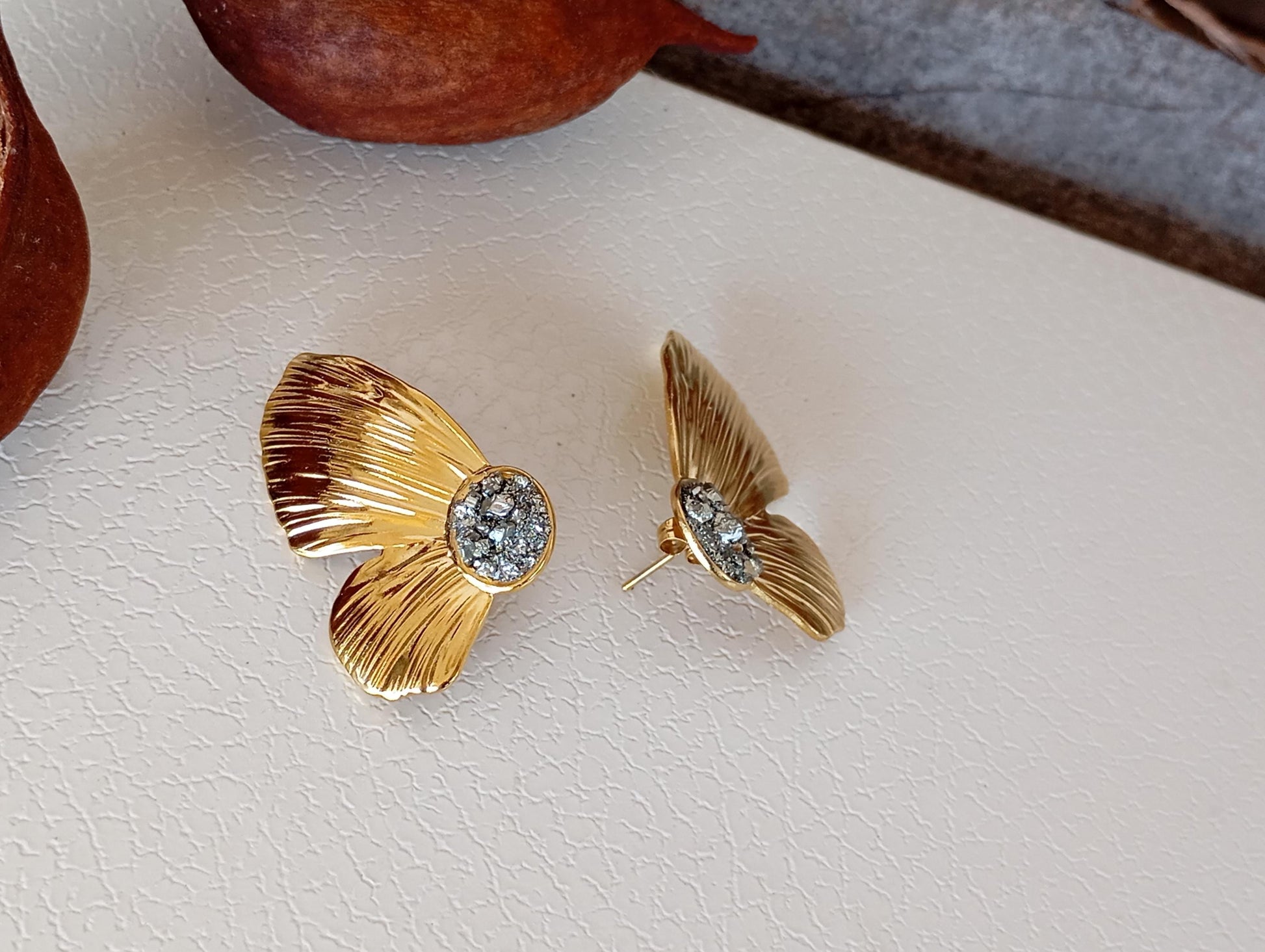 Enhance your style with these exquisite gold ginkgo petal flower earrings, featuring natural pyrite druzy stones. Inspired by the elegance of nature, these handcrafted earrings blend organic beauty with a touch of sparkle. The rich golden tones and shimmering pyrite make them a unique and eye-catching accessory, perfect for everyday wear or special occasions.