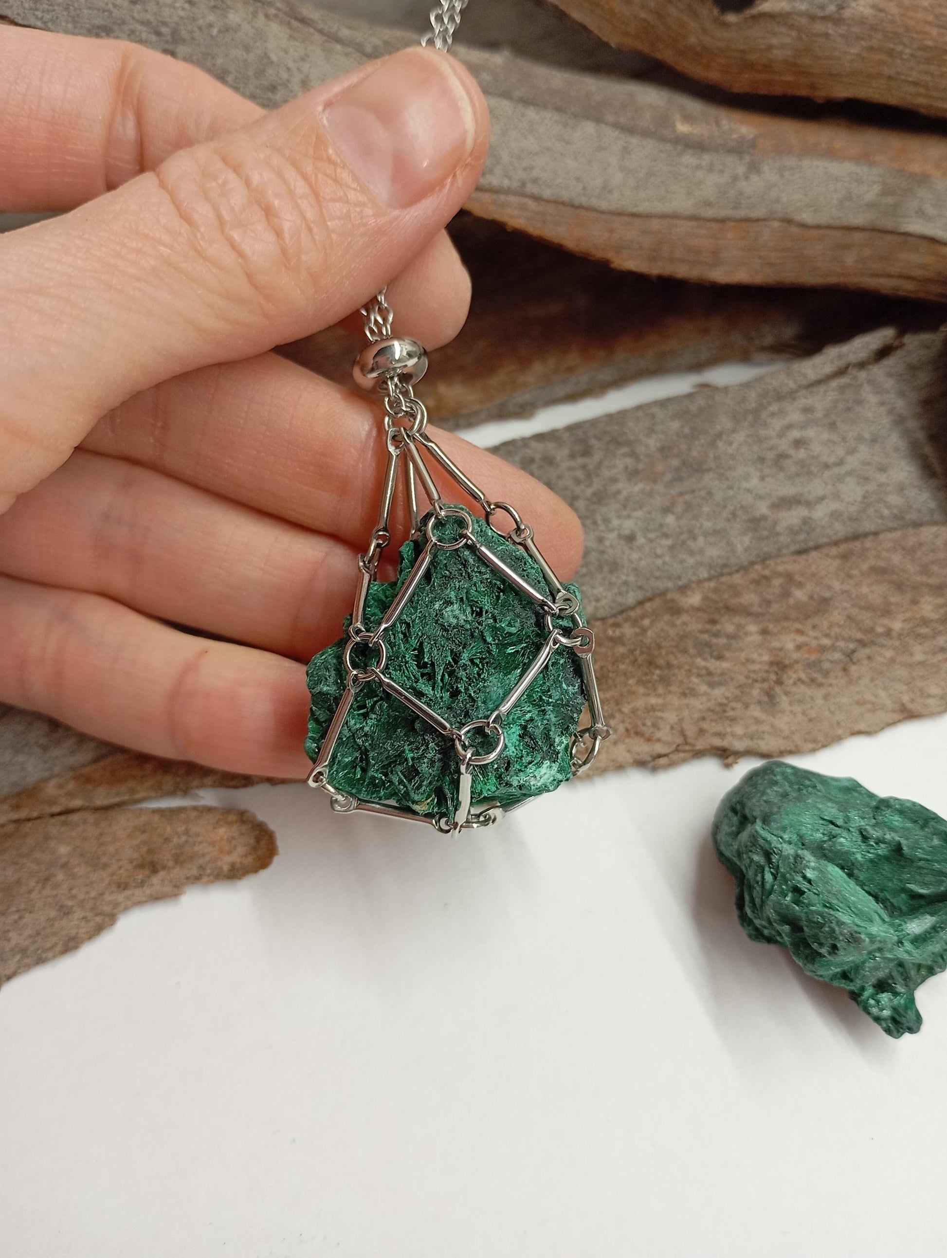 Natural Raw Malachite replaceable crystal stainless steel Cage Holder Crystal Pendant chain Necklace, Protection Healing Jewelry