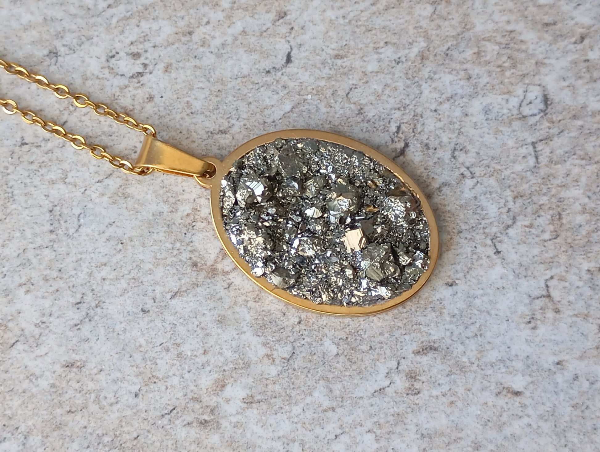 Women's oval shape pendant necklace with Raw Pyrite stones. Wealth stone, natural gemstone. Cameo charm pendant, gold plated stainless steel oval cabochon base.