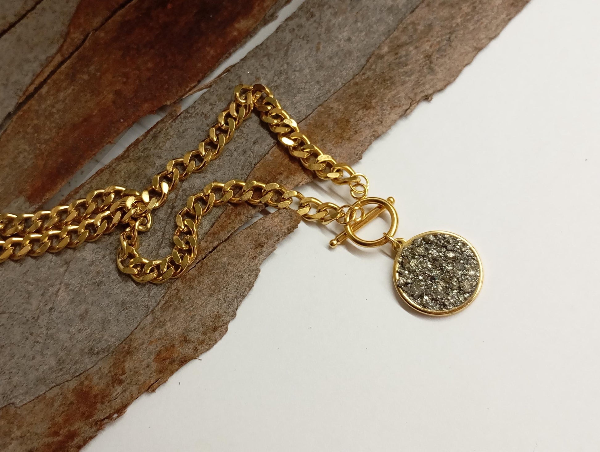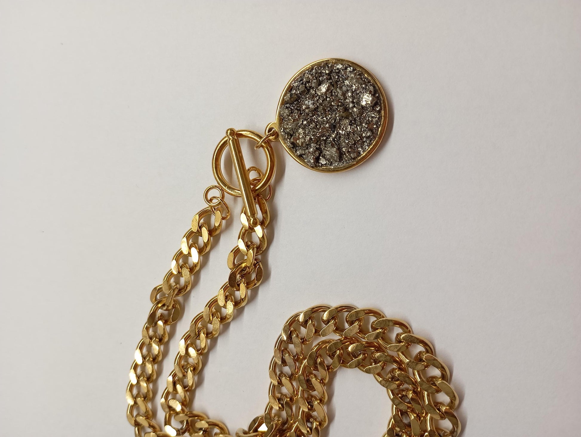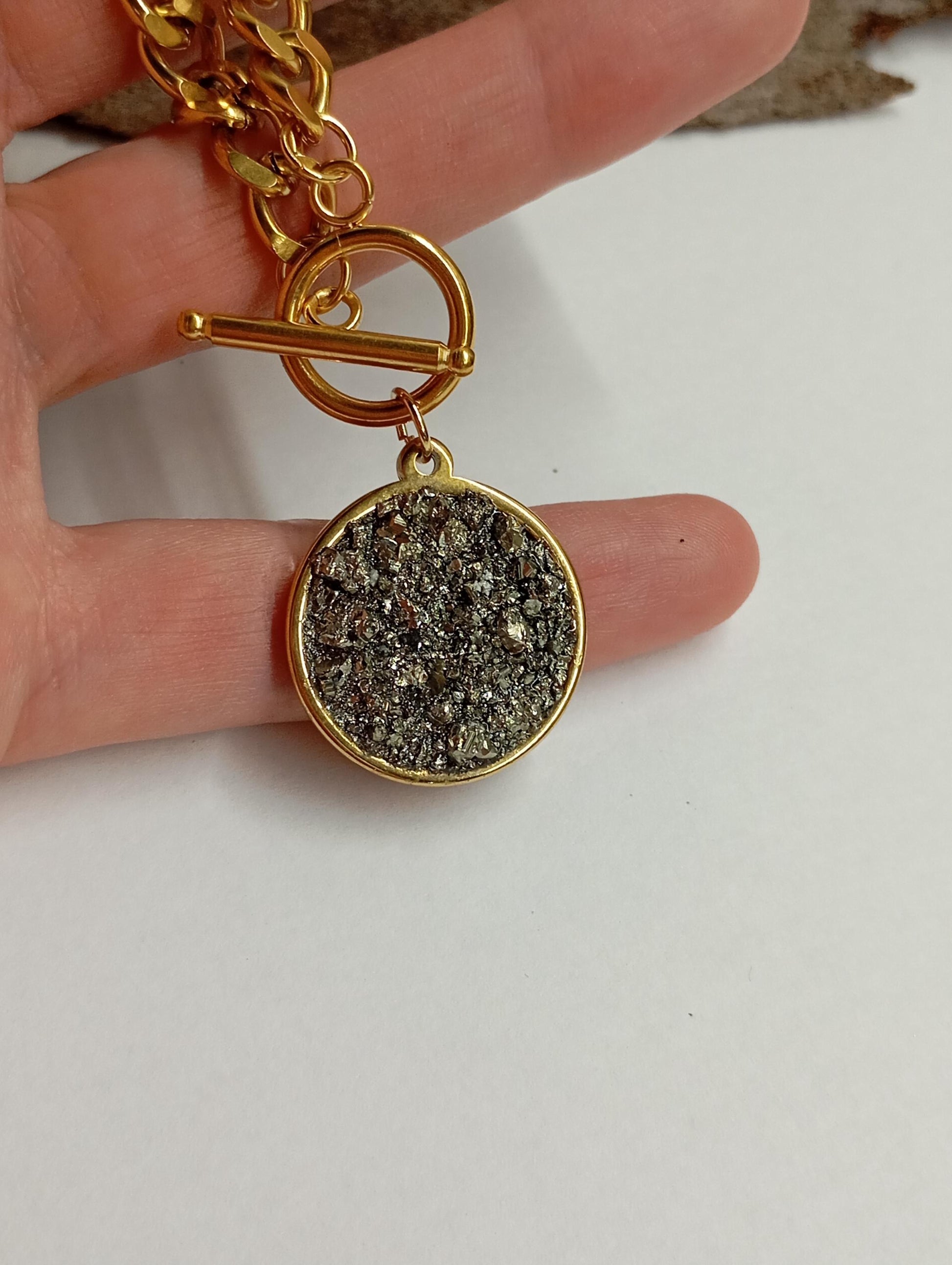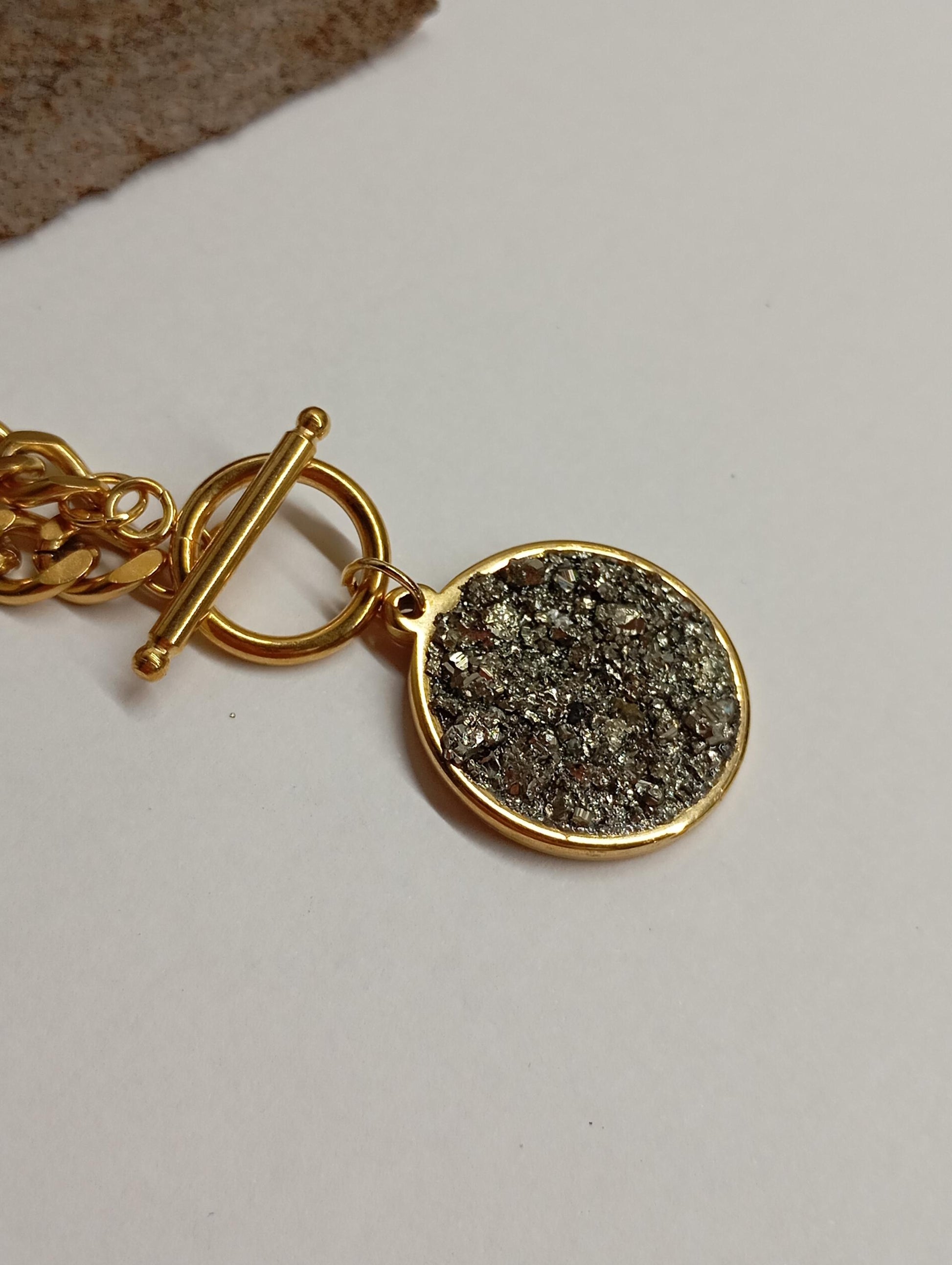Pyrite Cubes Pendant Necklace, Round cobochon, thick chain, Wealth stone,Confidence, success, Protection Healing,Handmade Pyrite Jewellery