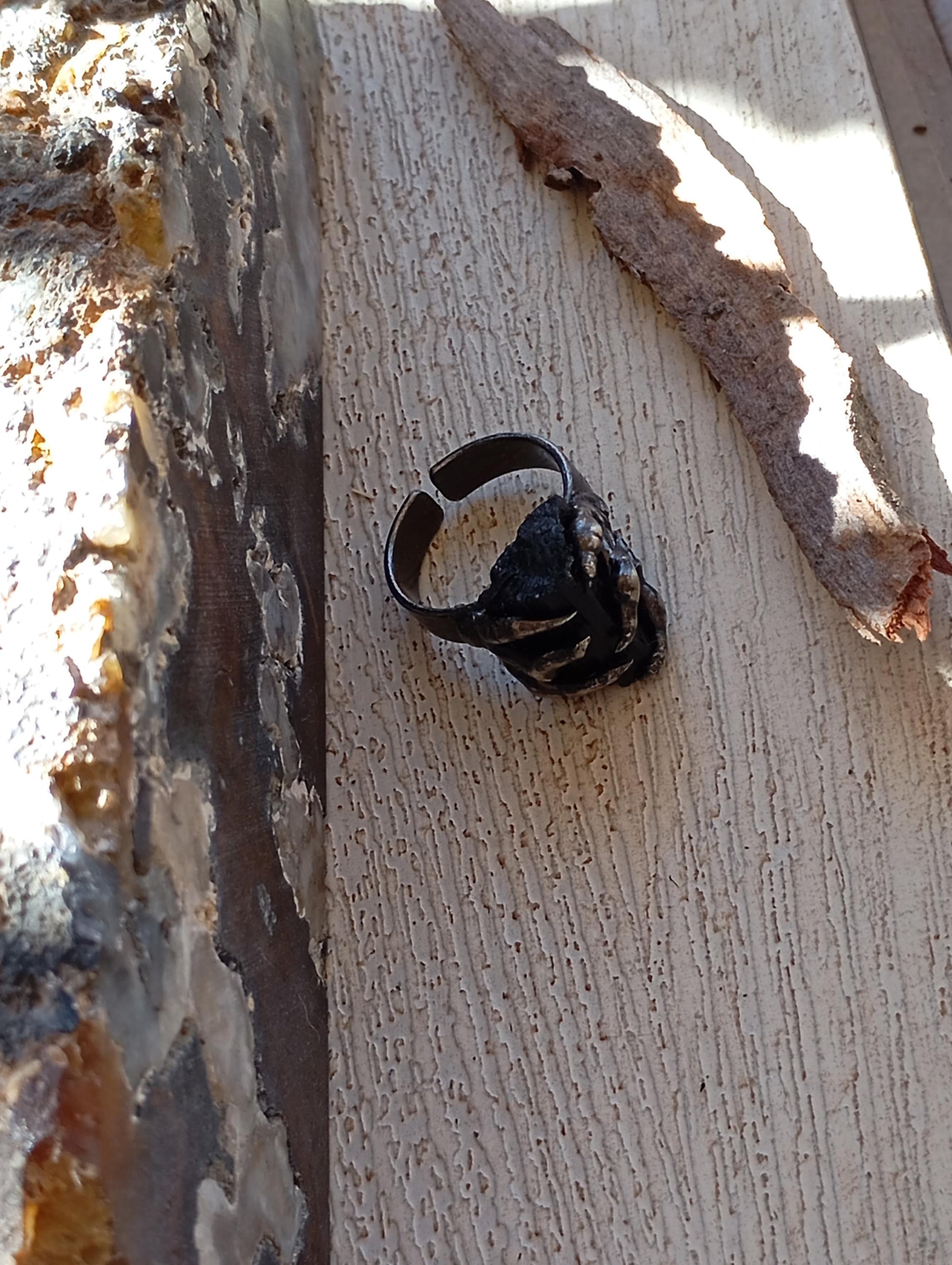 unique , adjustable open finger ring with bronze edge raw black tourmaline, clawing ring, reiki, amulet, mascot accessories, healing, protection, antique, unisex
