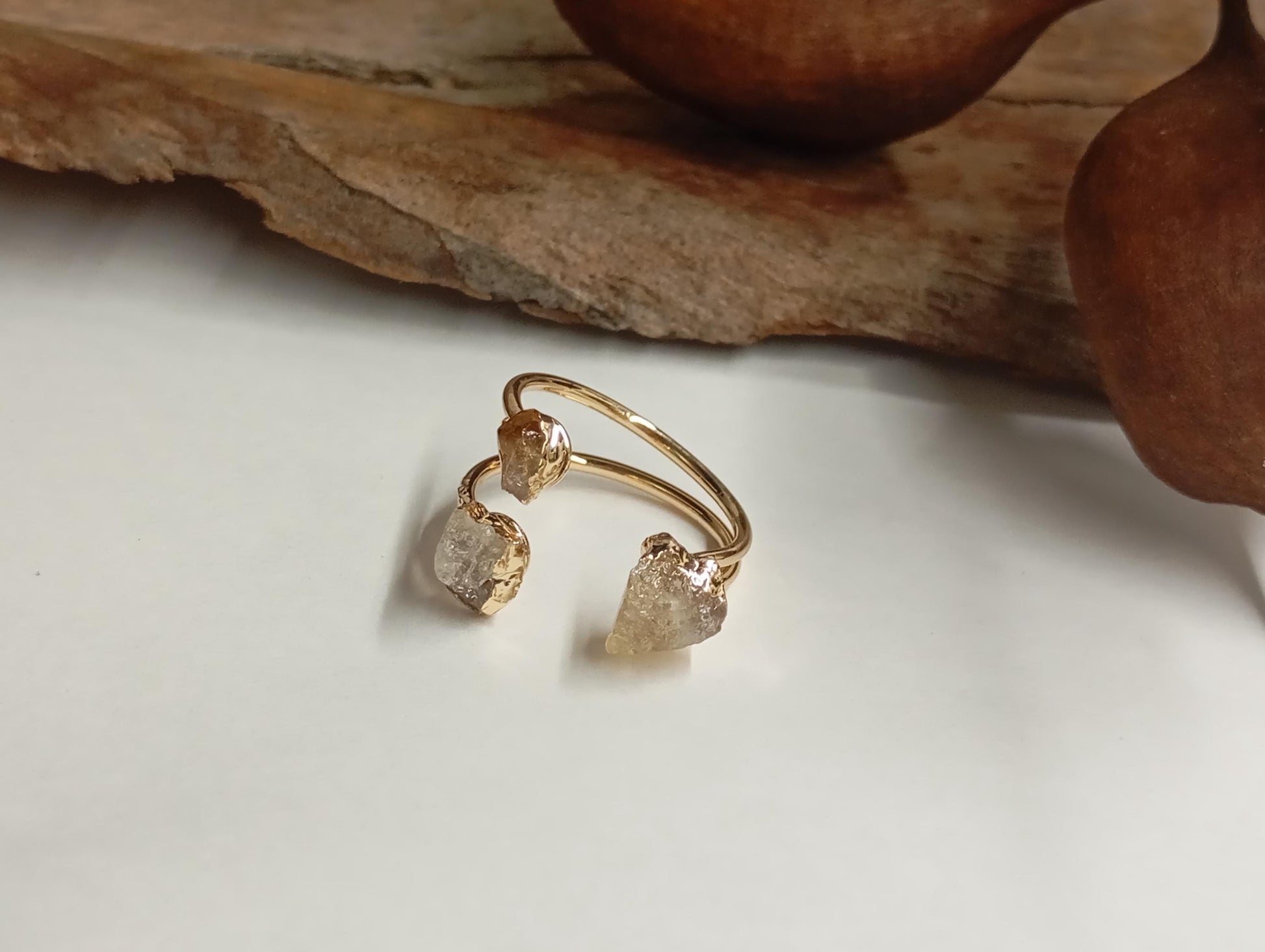 Raw Citrine three crystals gold edge crystal open finger ring, gemstone, exquisite dainty elegant, wedding, gift for women, healing mascot