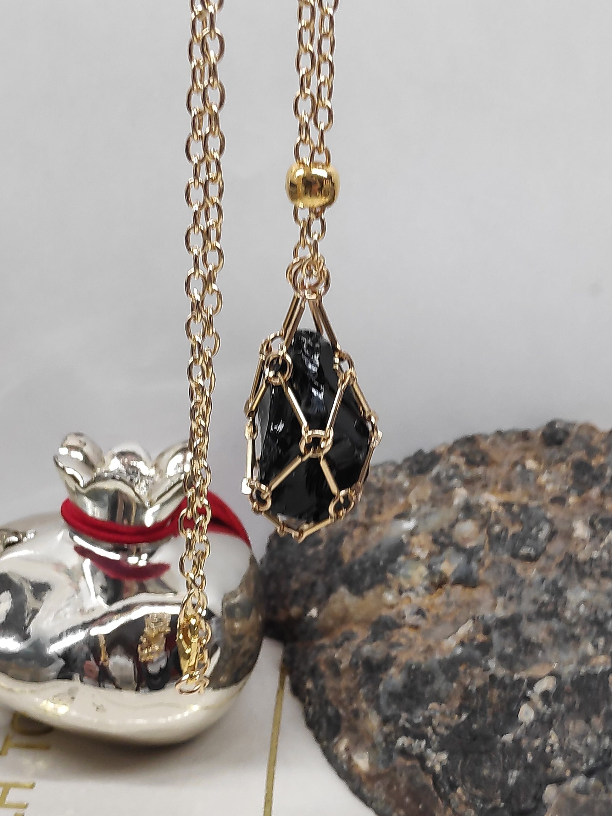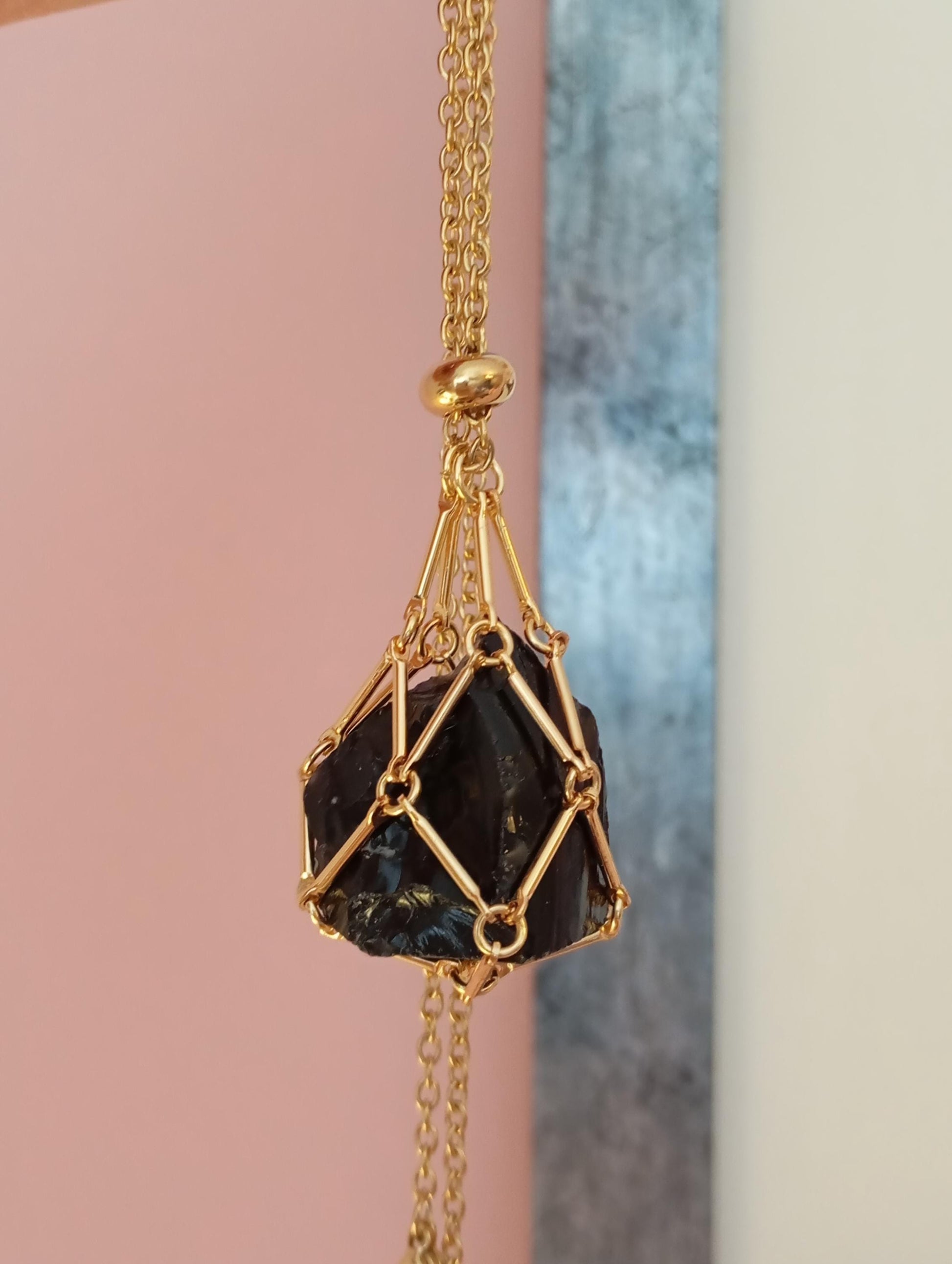 Women's pendant necklace stainless steel in gold and in silver, with Brazilian Raw Black Obsidian, cage crystal holder pendant, dainty necklace with replaceable crystal, easy to insert other crystal.