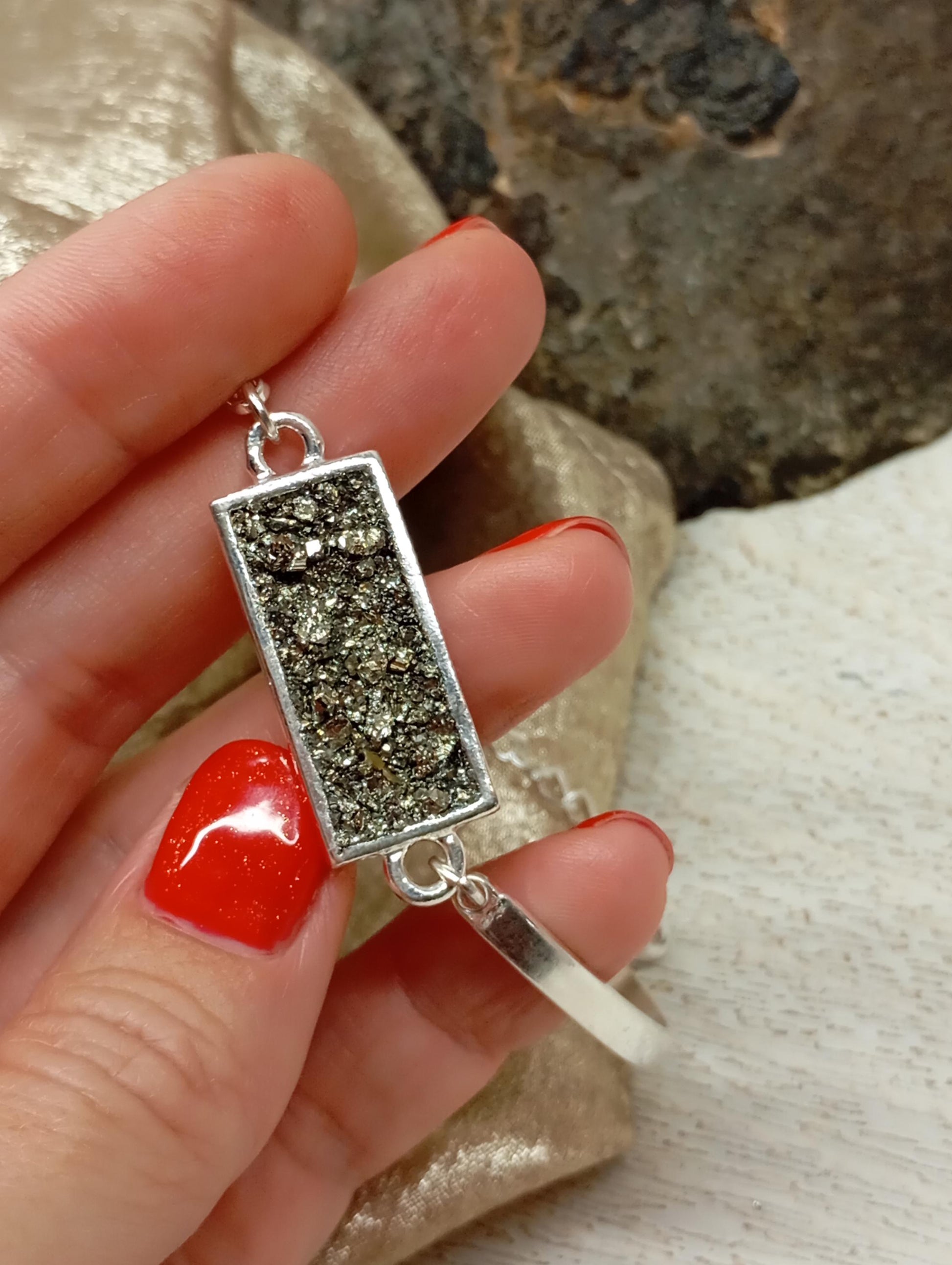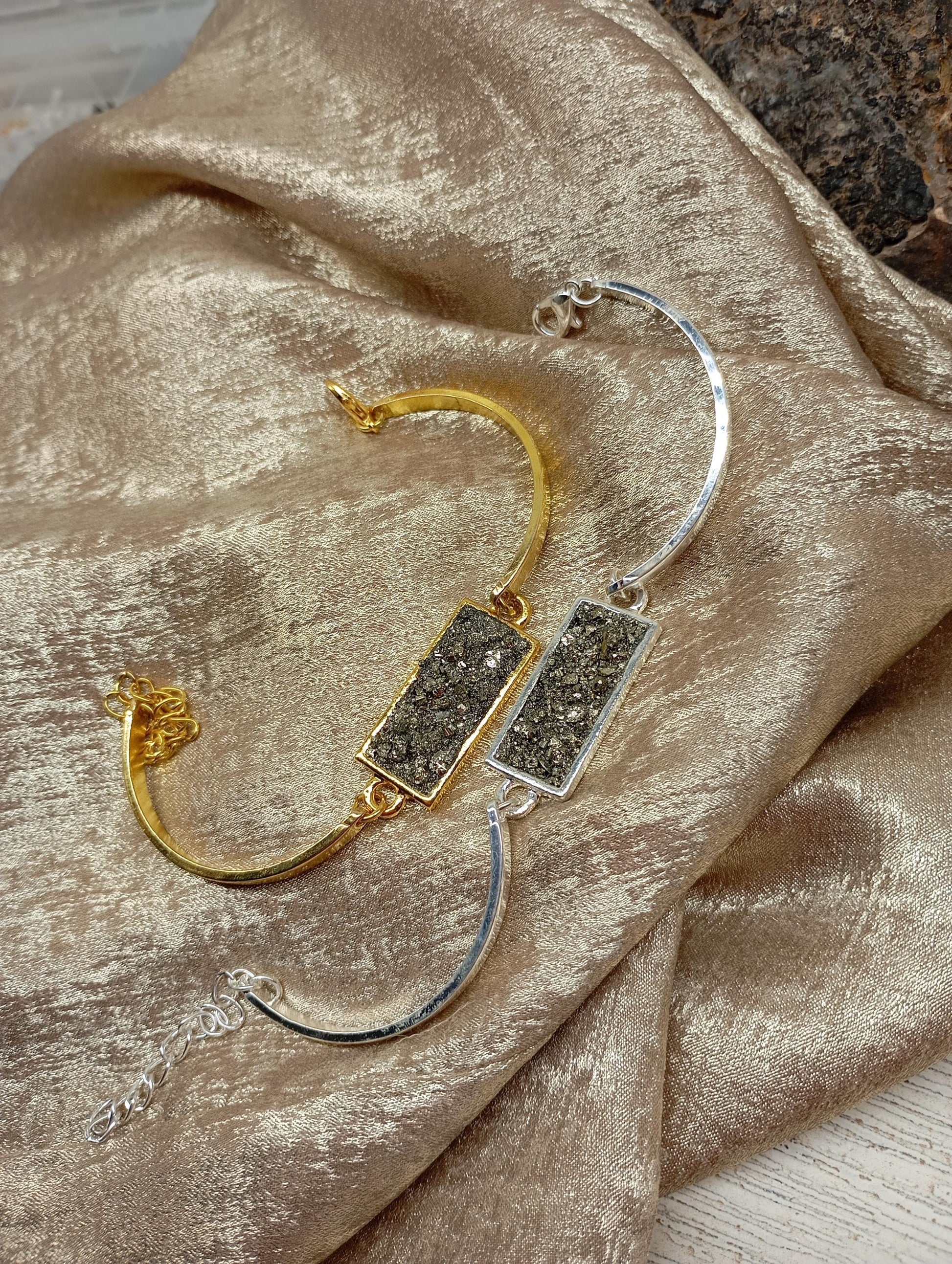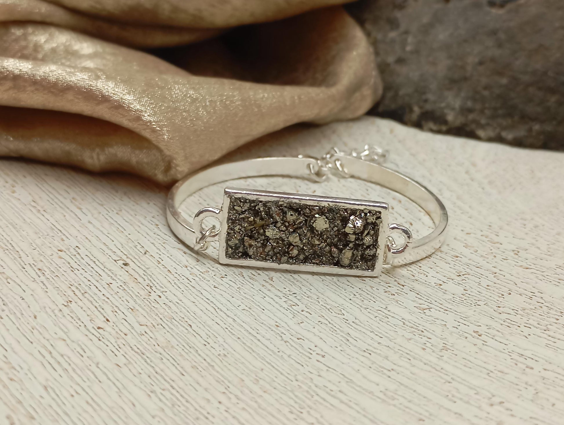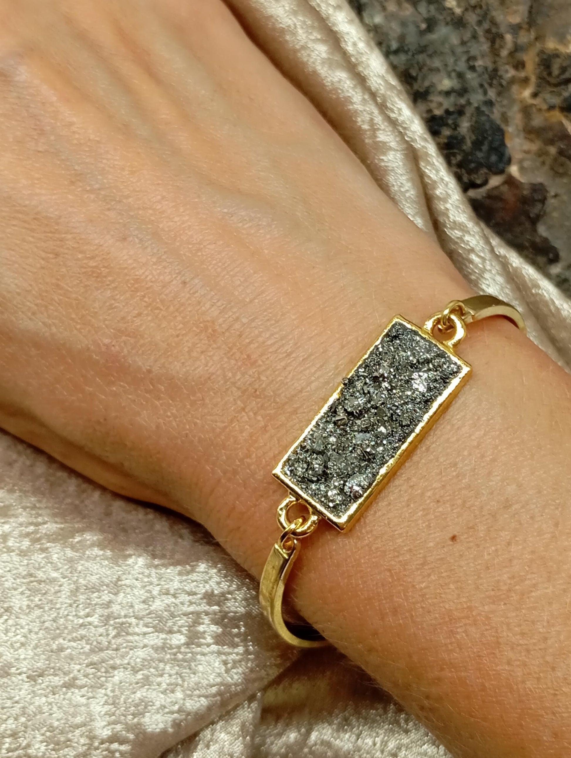 Beautiful handmade adjustable bracelet for women, stainless steel bracelet gold plated or silver plated with rectangular cabochon base filled with small crystals of raw pyrite.