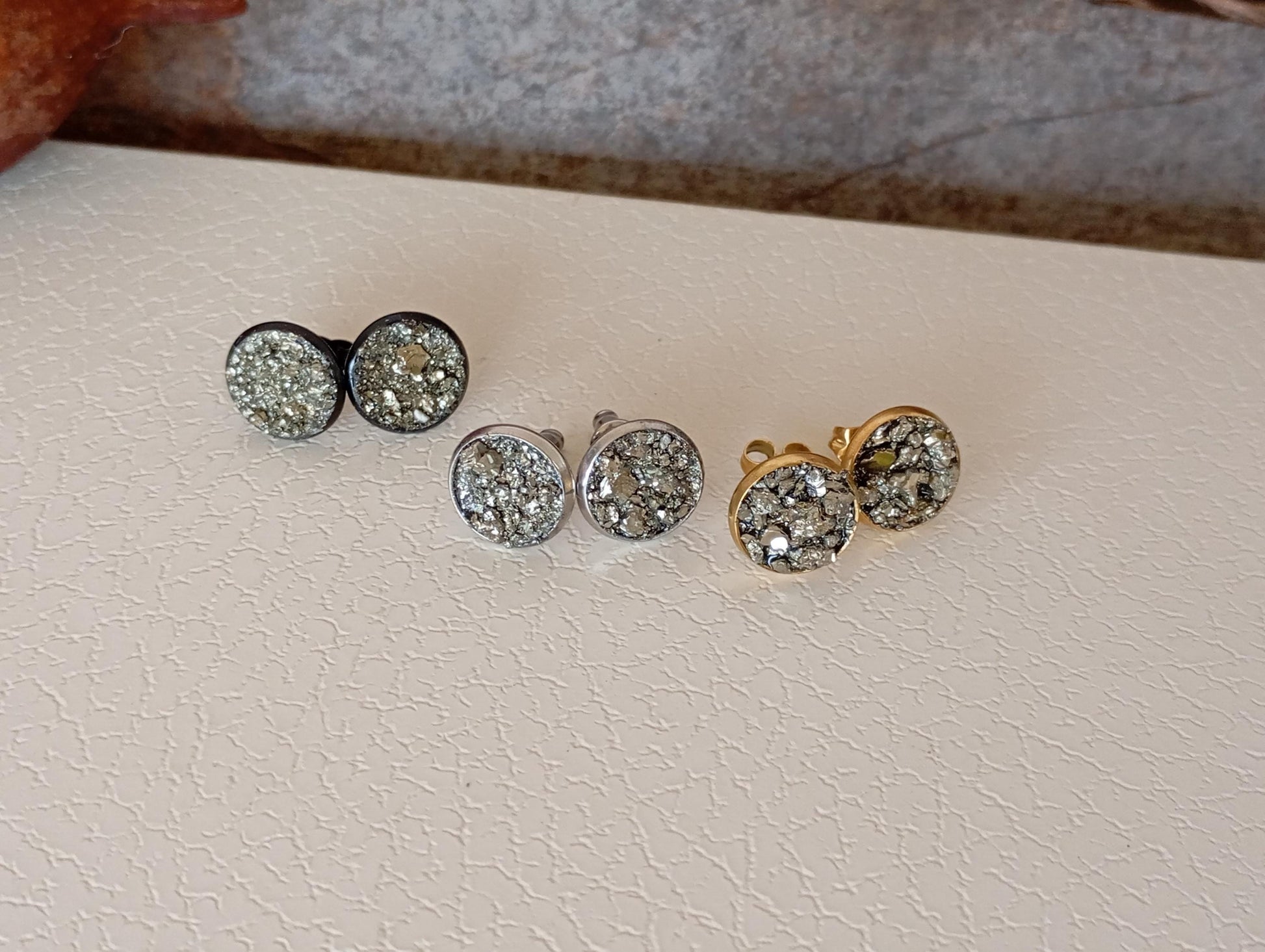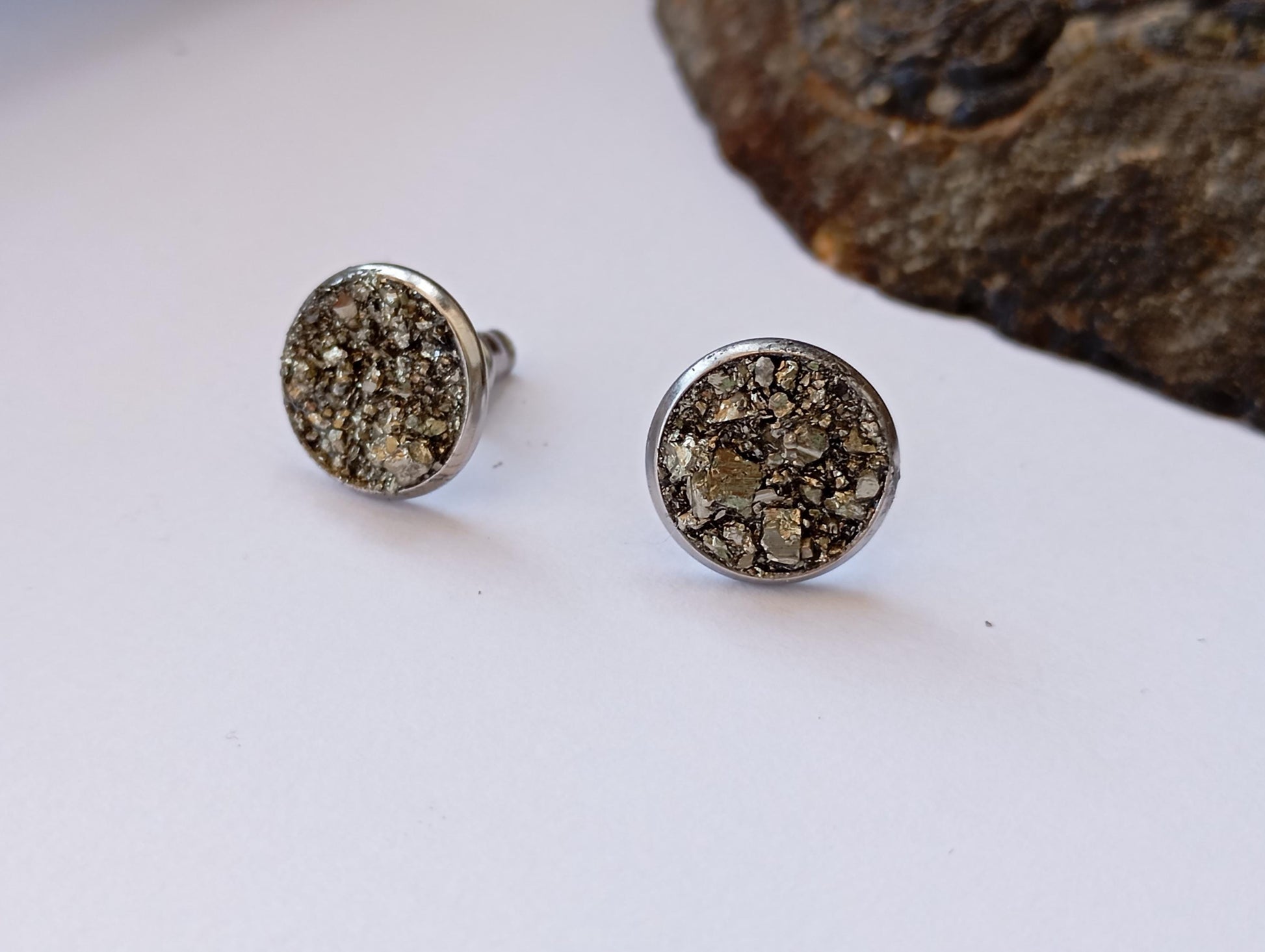 Raw Pyrite crystals round cabochon 10mm stud earrings, stainless steel gold plated, in black colour and steel base in your choice.