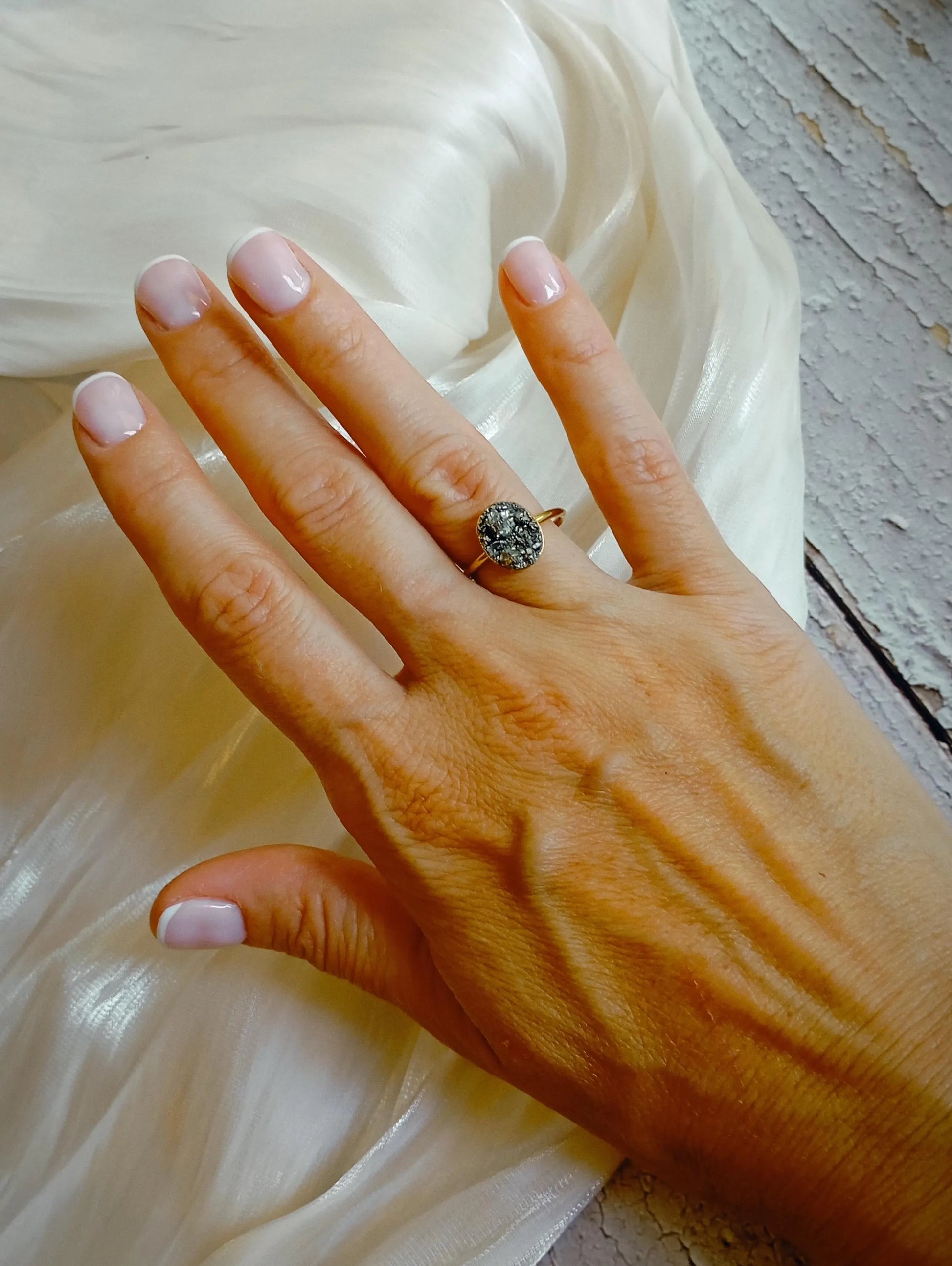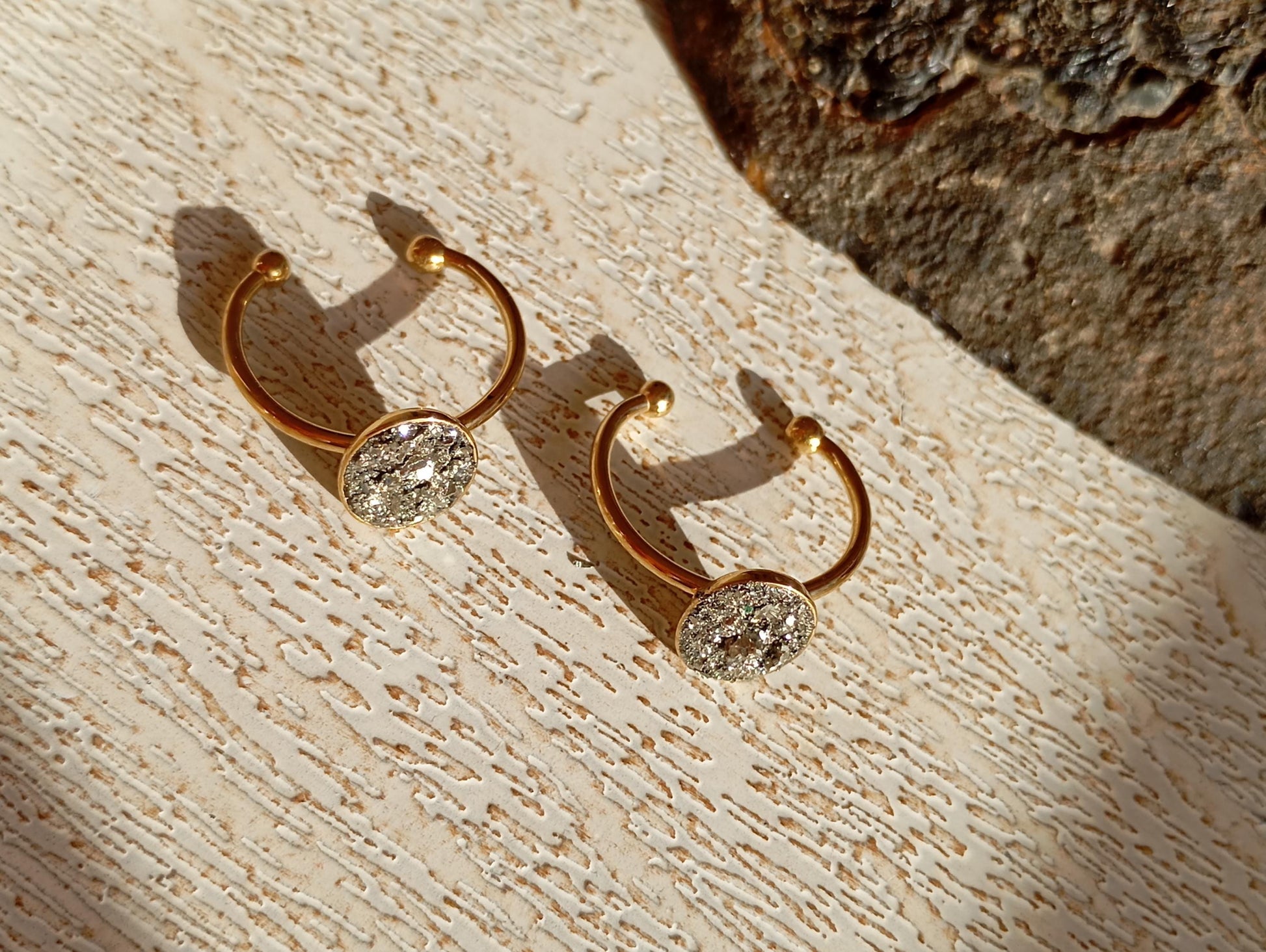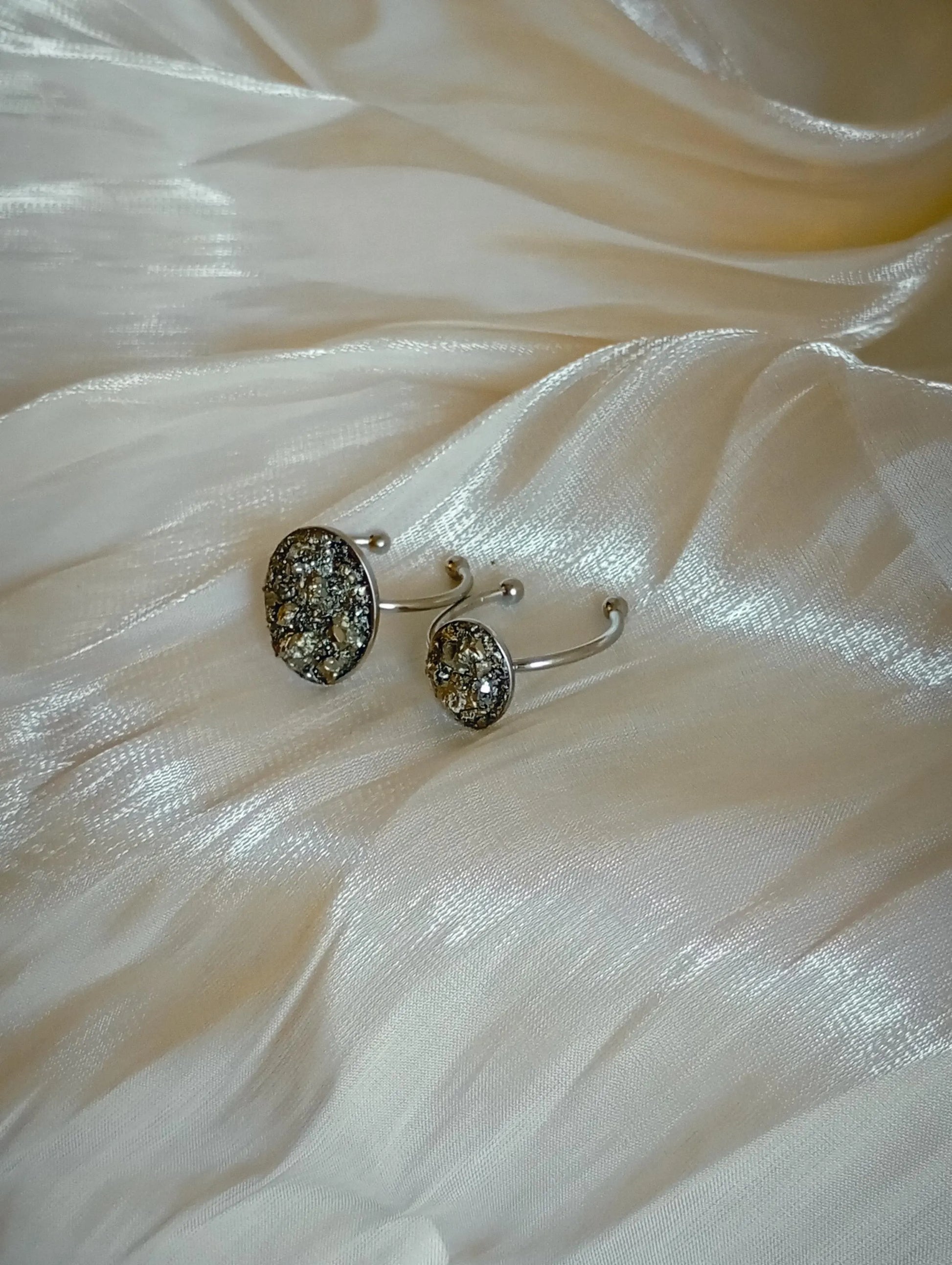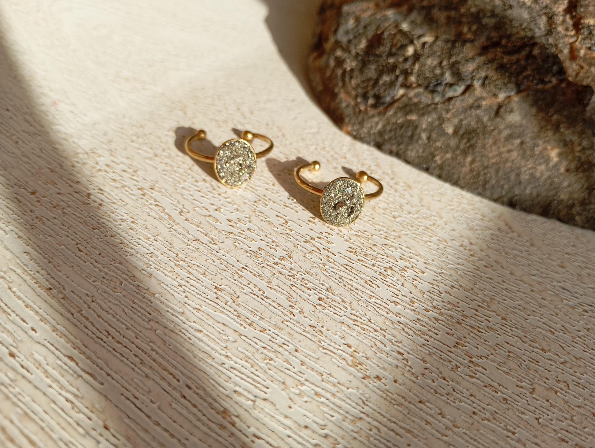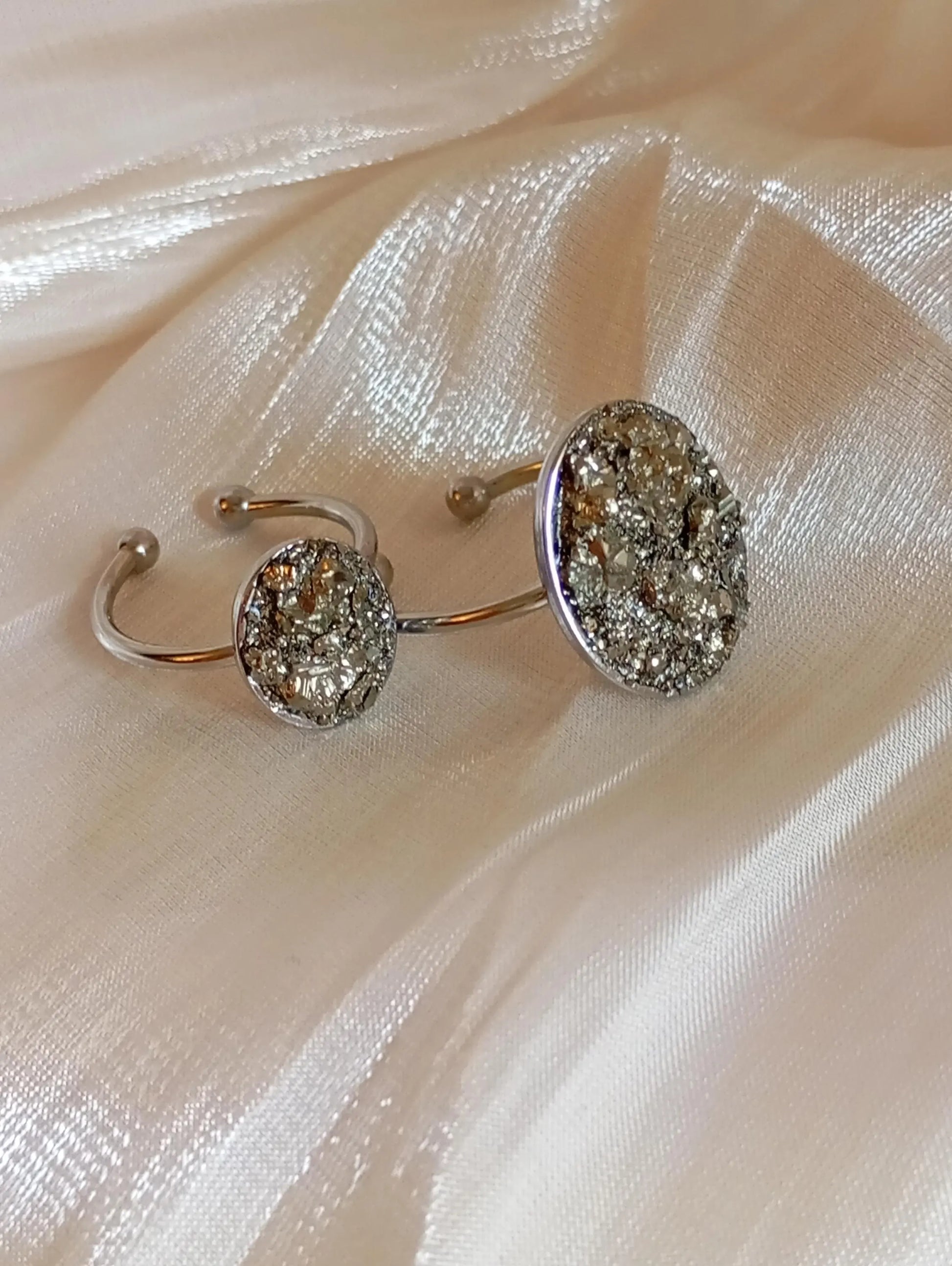 Each ring is individually handmade, and the natural pyrite arrangement ensures that every piece is truly one of a kind.
