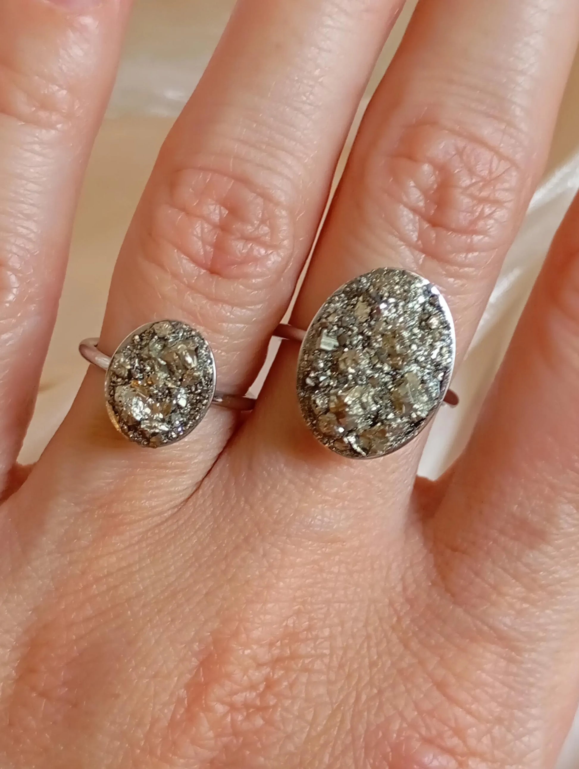 This handcrafted adjustable ring features a sparkling oval design filled with natural raw pyrite chips, carefully arranged and secured with professional jewelry-grade adhesive. The textured surface creates a rich metallic shimmer and an organic, artisan finish.